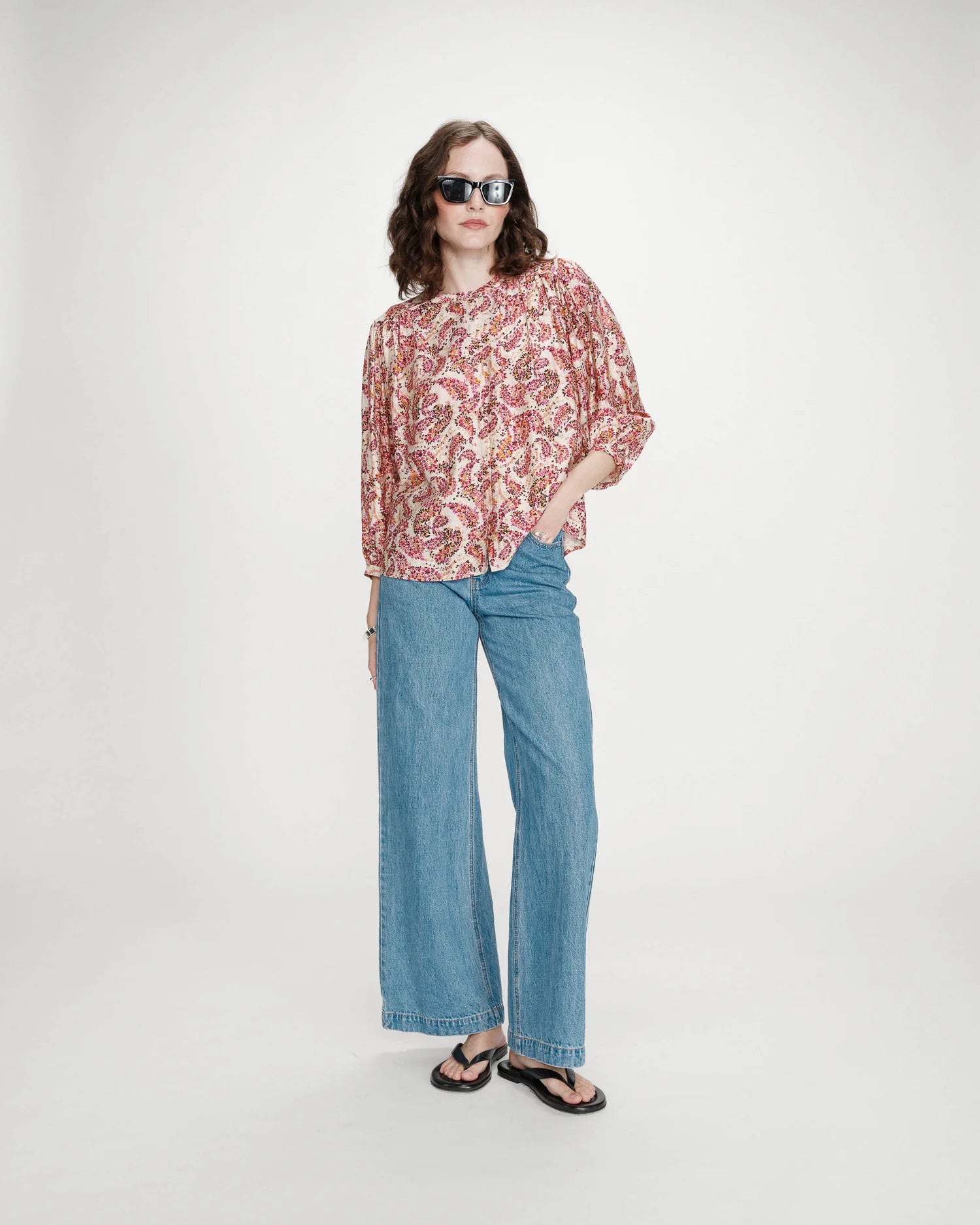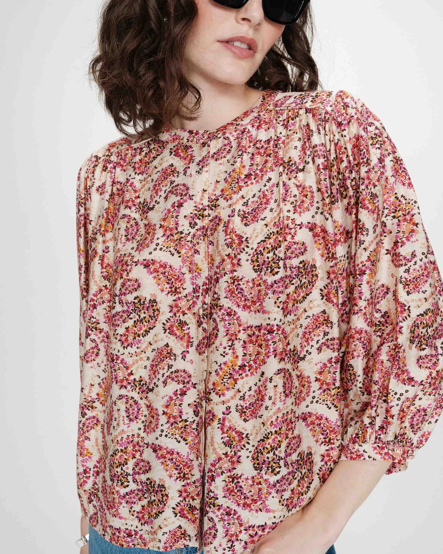 El corte amplio de la blusa de cuello redondo VEZIA, realzado con un estampado cachemira, crea una silueta marcada y bohemia. Las mangas tres cuartos y los frunces en los hombros aportan un toque sutil de elegancia y resaltan la feminidad del modelo. La blusa estampada VEZIA tiene una tapeta de botones en la parte delantera.
