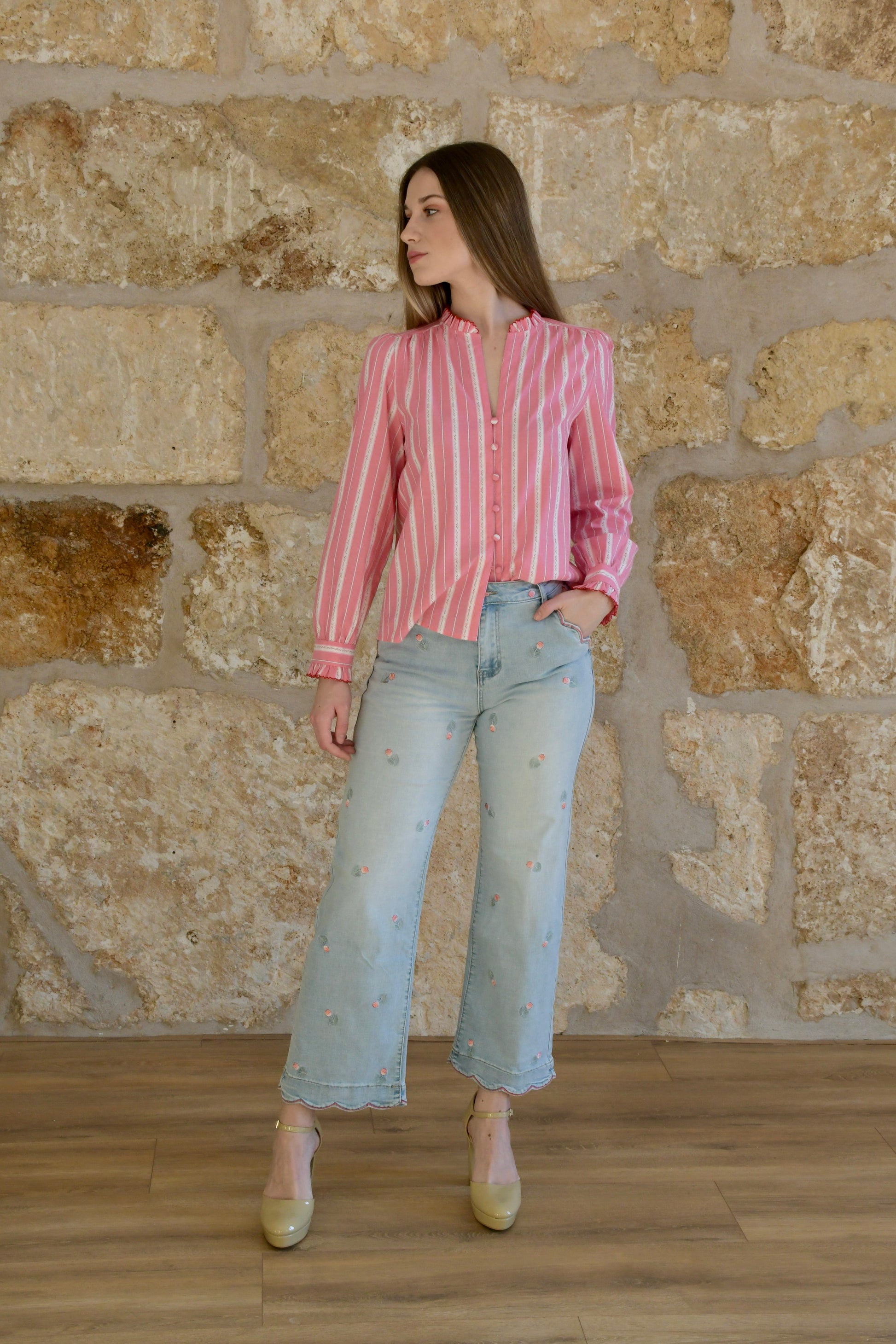 La silueta fluida de la blusa Juliette, realzada con un estampado de rayas verticales en tono rosa coral, estiliza con suavidad y aporta luz al rostro. Su diseño limpio y estructurado se acompaña de pequeños detalles que marcan la diferencia: cuello fruncido, puños con volante delicado y botones forrados al tono en la parte delantera.