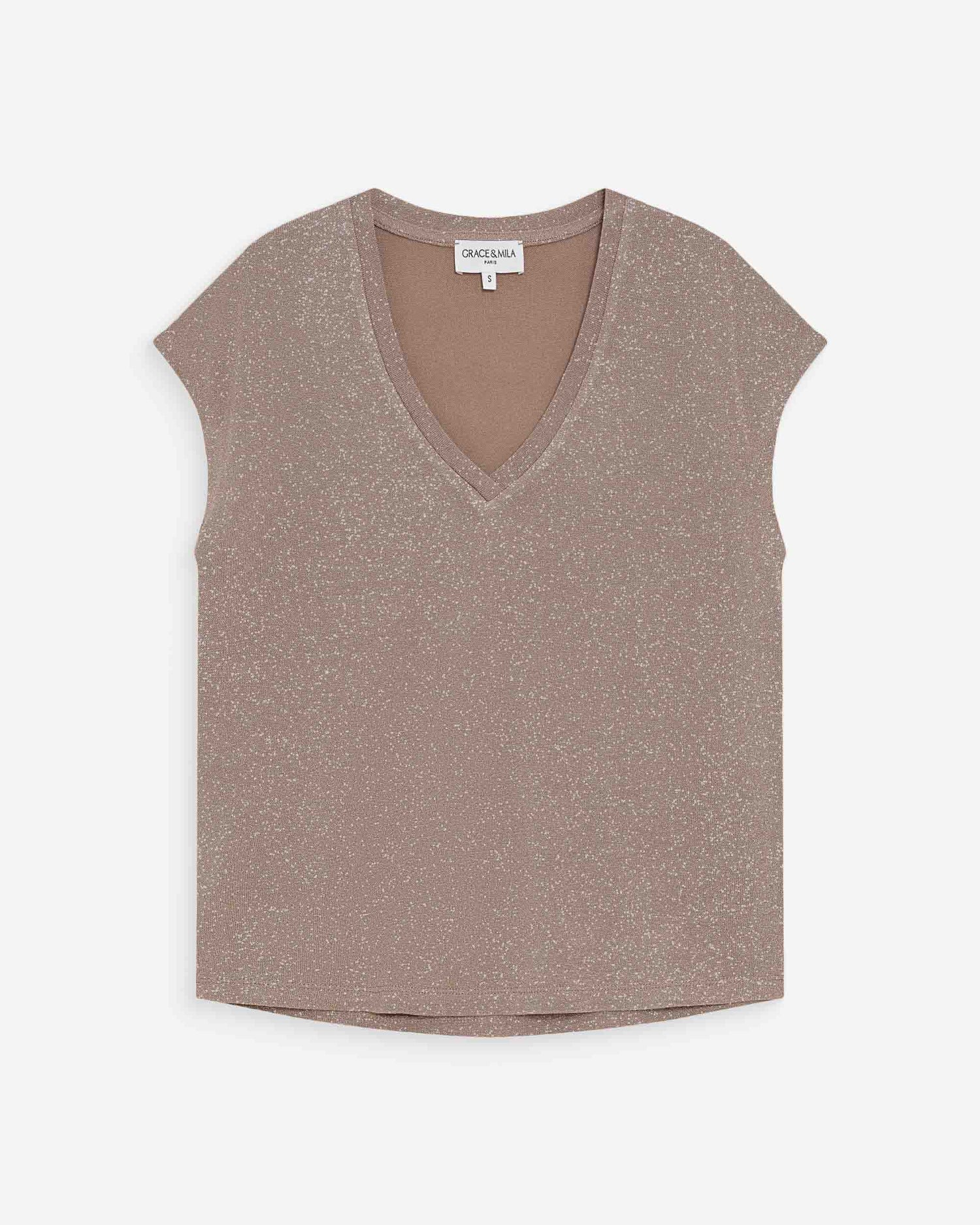 El top de manga corta VALSONS está confeccionado en lurex para dibujar una silueta depurada y luminosa. El modelo presenta mangas cortas y un escote en V que realza las curvas femeninas. El top de lurex VALSONS ofrece un look sencillo y desenfadado gracias a su corte recto