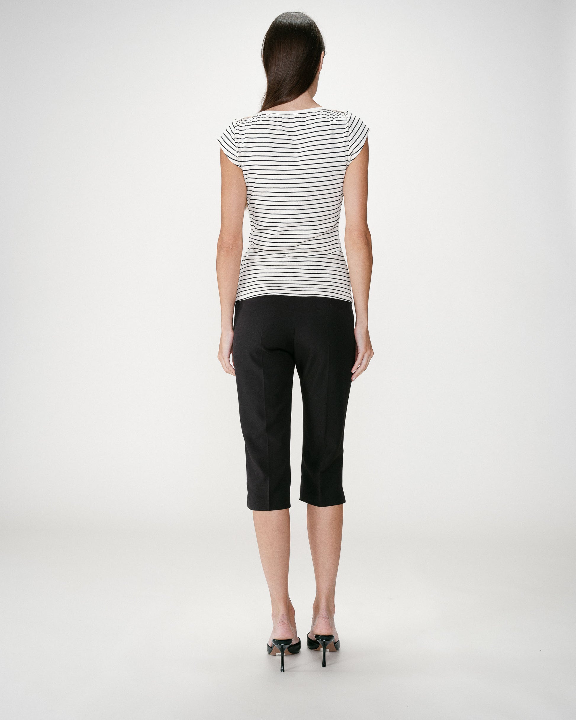 El corte ajustado y el escote barco de la camiseta de punto acanalada a rayas de manga corta WAKE realzan las curvas femeninas. El modelo está confeccionado en tejido de mezcla de algodón a rayas con bordados de 'G&M'.