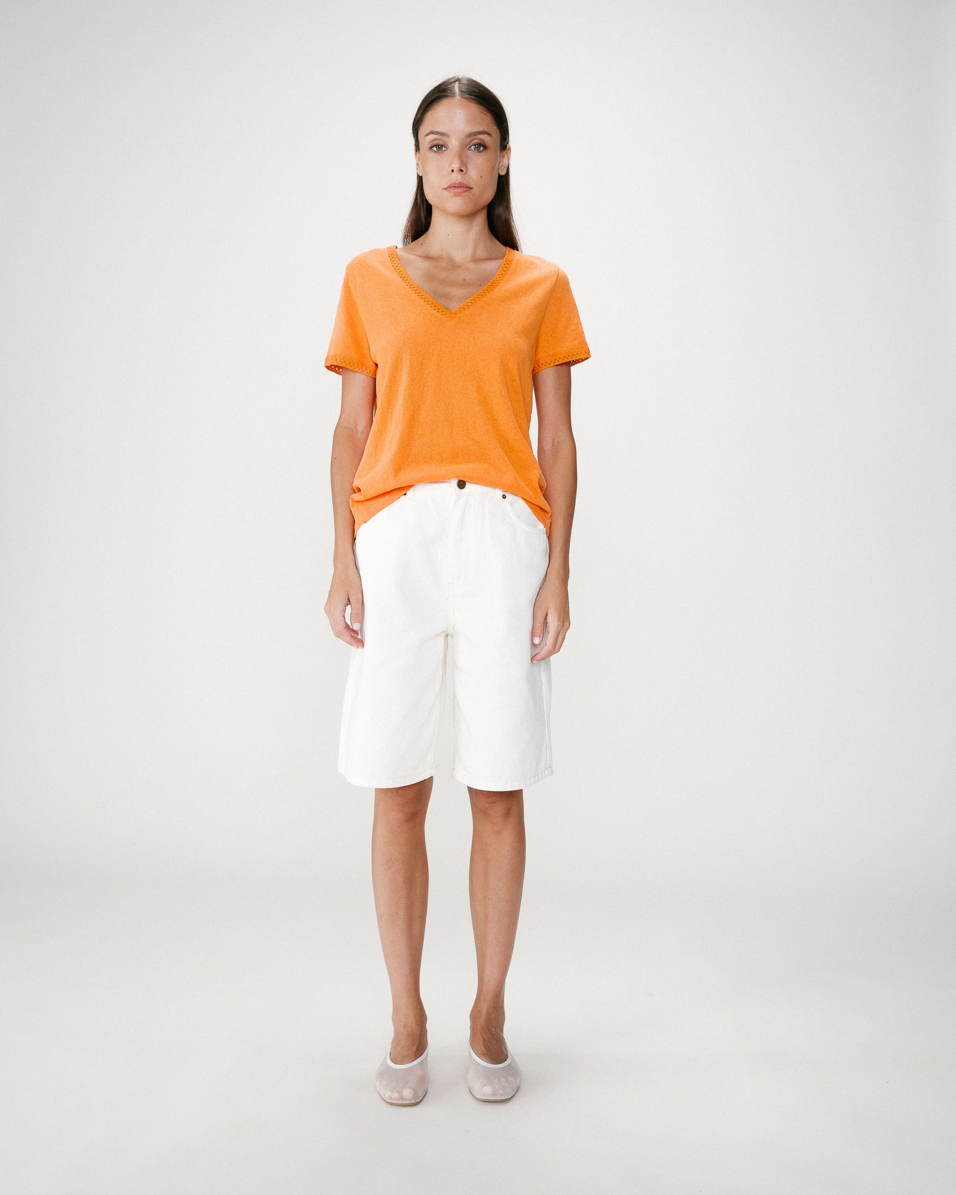 Camiseta de color naranja vibrante confeccionada en tejido ligero que aporta frescura y comodidad. Presenta escote en pico con detalle de encaje decorativo que añade un toque femenino y delicado, además de mangas cortas con el mismo acabado. Su silueta fluida la convierte en una prenda ideal para el día a día, fácil de combinar con jeans, pantalones claros o faldas. Perfecta para looks casuales con un toque especial.