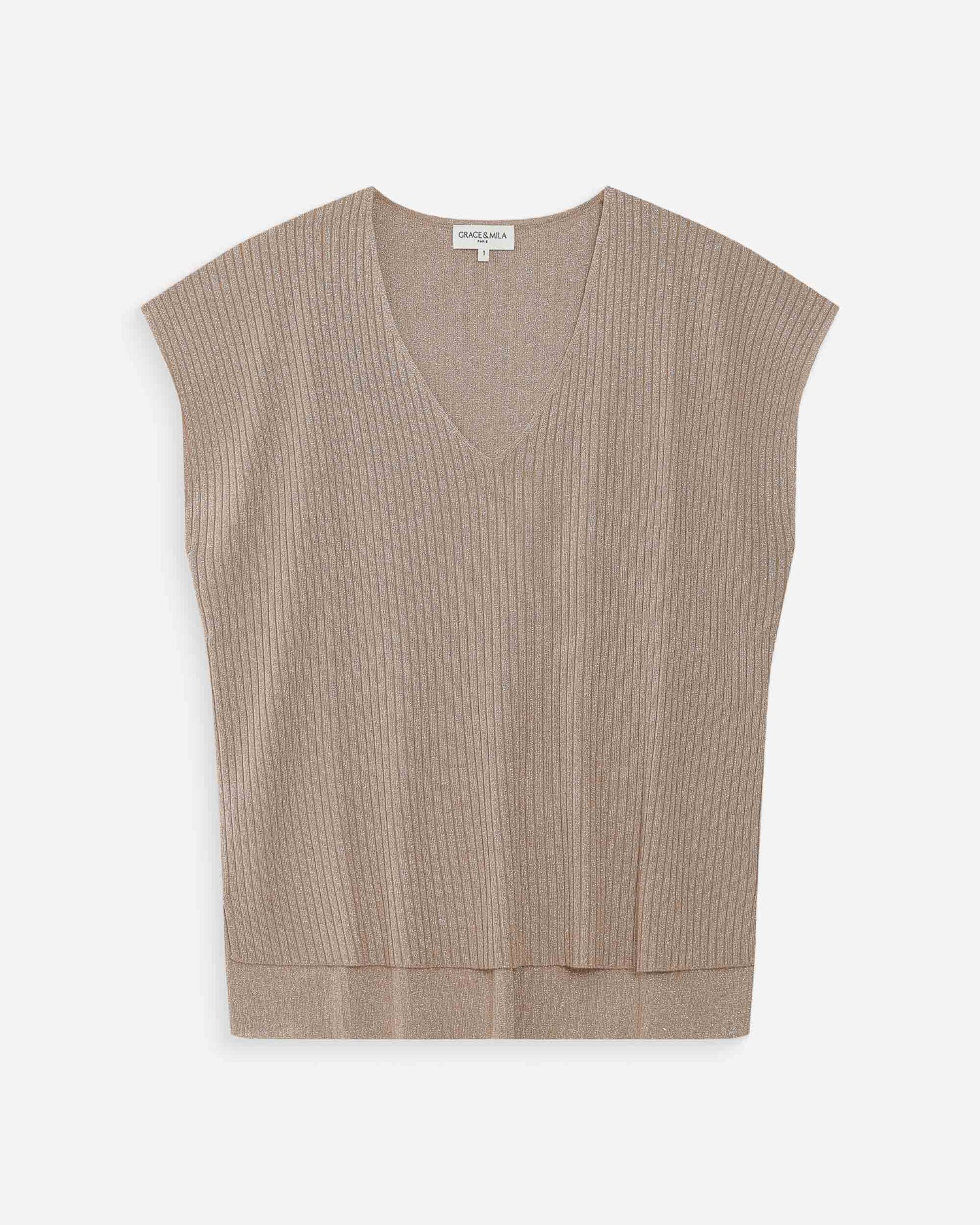 El top de lurex VAPORO es una prenda sin mangas confeccionada en un punto acanalado. El hilo fino, compuesto de poliéster reciclado y lurex, aporta un acabado luminoso y brillante. La corte amplio del top VAPORO y su escote en V realzan la silueta femenina.