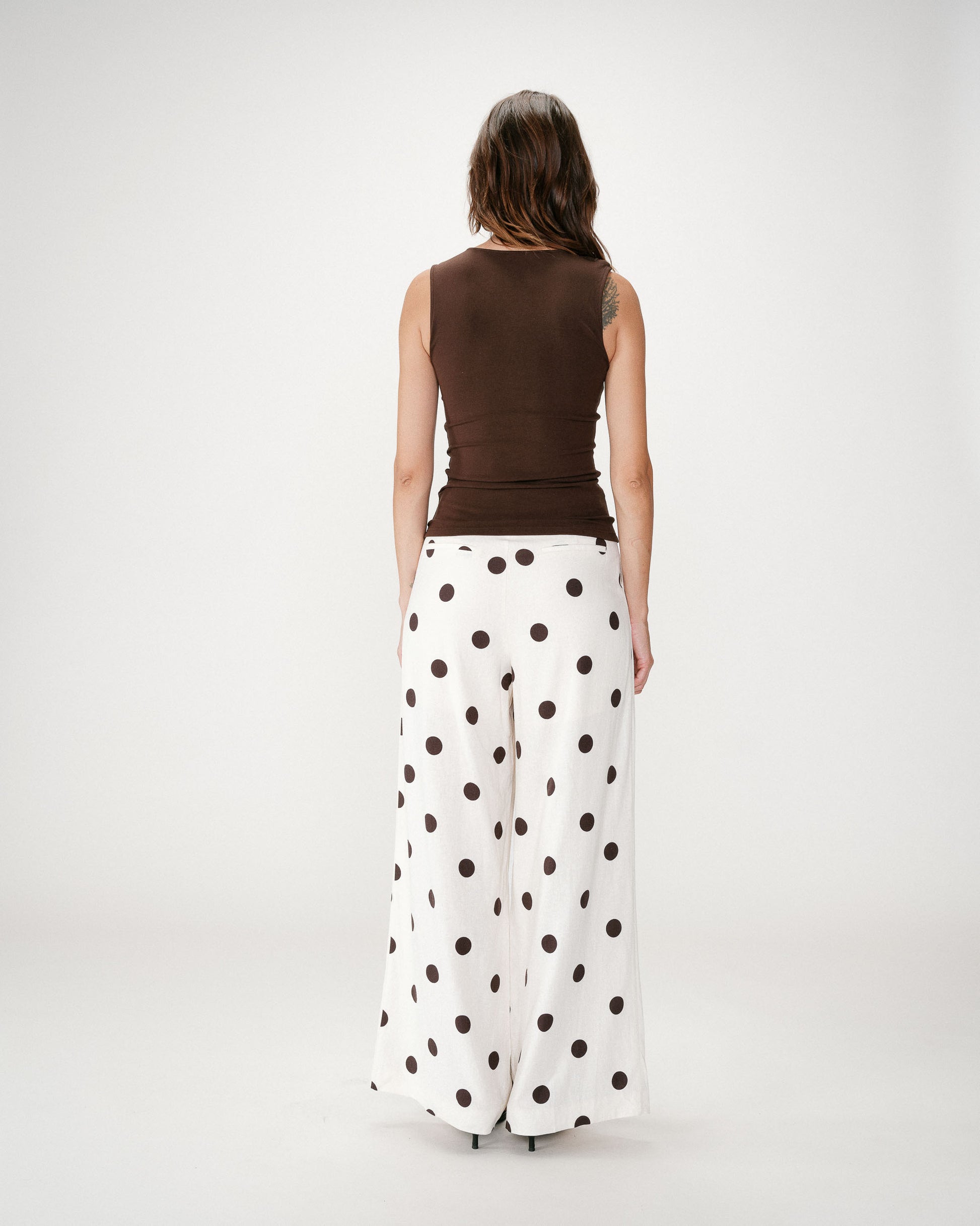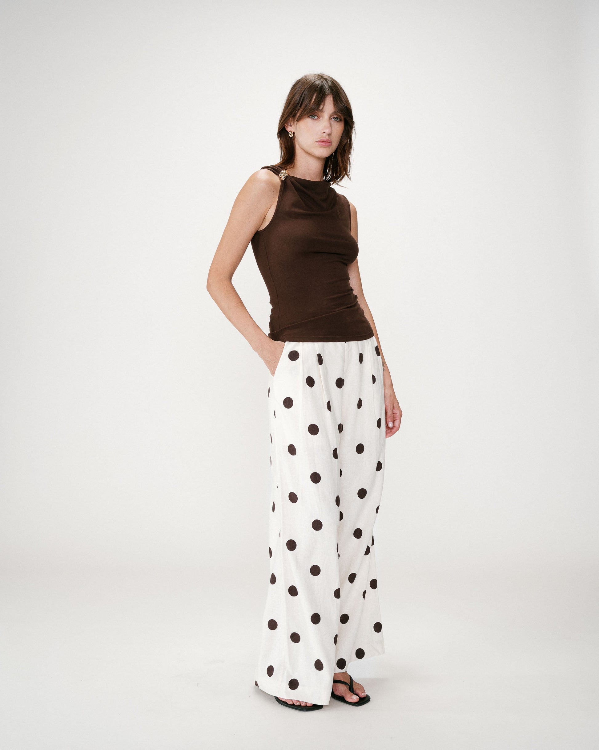 Top de color marrón chocolate con diseño minimalista y sofisticado. Presenta escote cerrado y silueta ajustada que realza la figura, combinado con un aplique metálico decorativo en el hombro que aporta un toque elegante y diferencial. Su acabado limpio y su caída suave lo convierten en una prenda versátil, ideal para elevar cualquier look. Perfecto para combinar con pantalones fluidos, sastreros o denim y crear estilismos tanto de día como de noche.