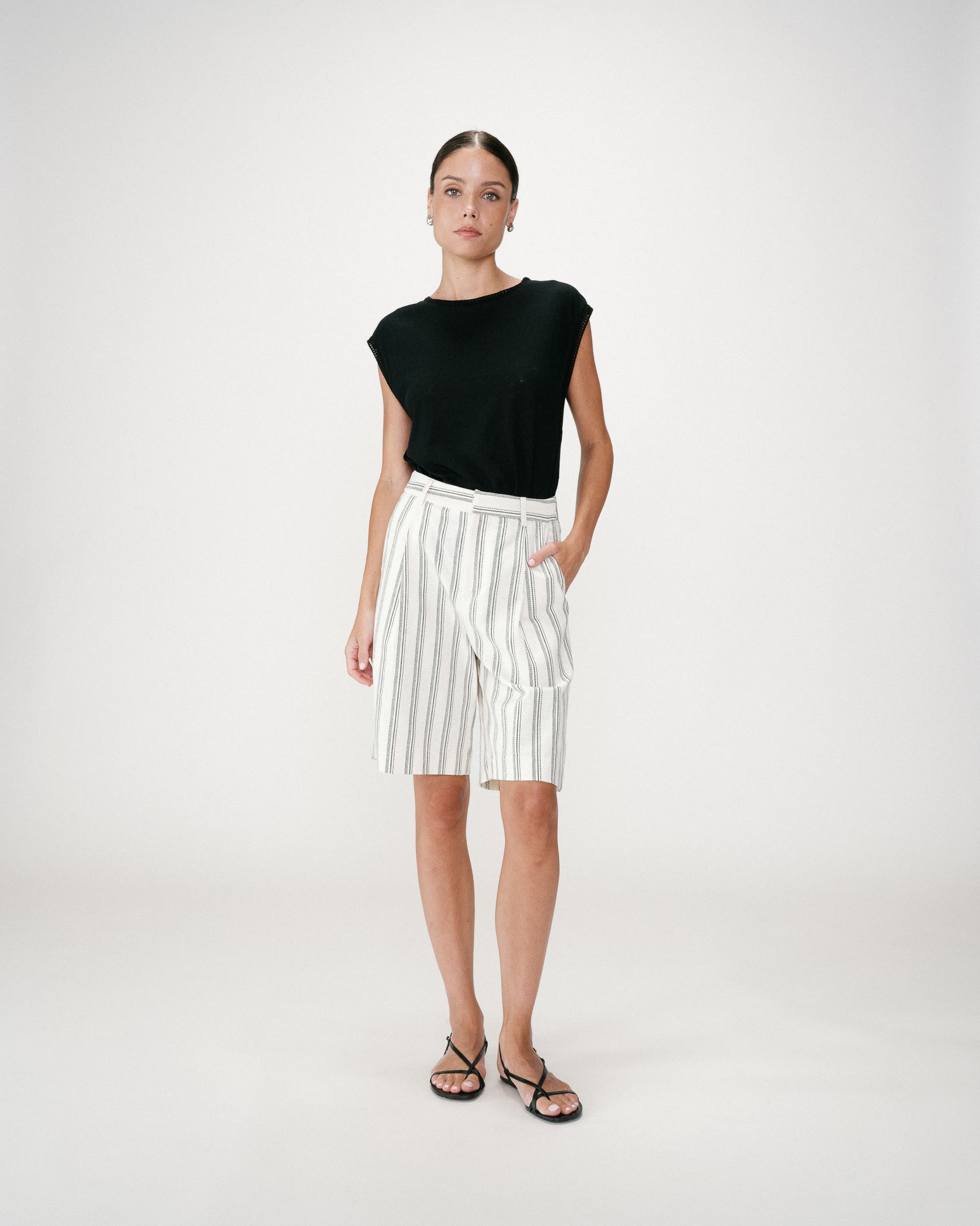 Confeccionada en tejido de rayas verticales, la bermuda ancha WELLO es una prenda moderna y elegante. La cintura de talle medio se combina con pliegues que le aportan un toque de sofisticación a esta prenda estructurada. El modelo cuenta con bolsillos ribeteados en la parte trasera y bolsillos italianos en la parte delantera.