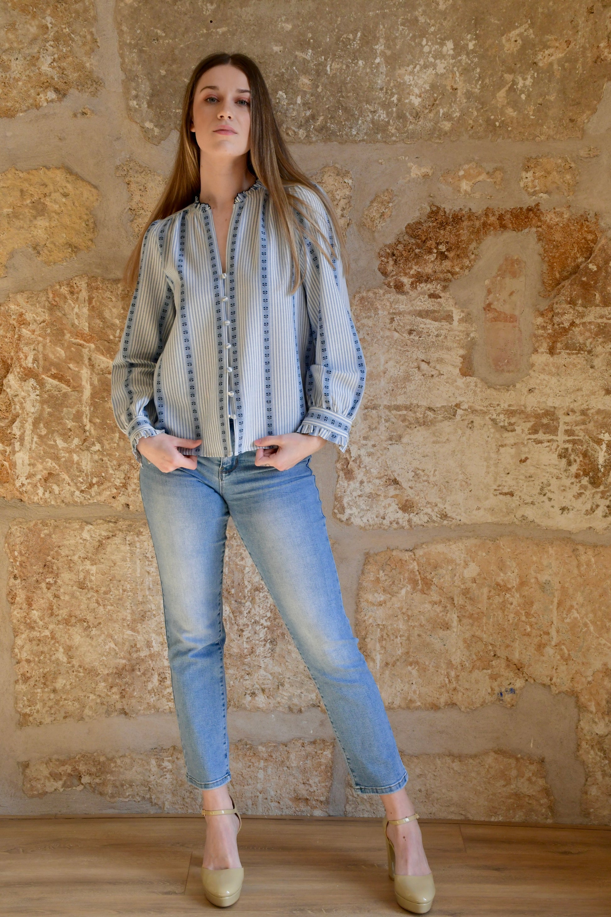 La blusa Margot combina rayas finas en azul con delicados motivos florales en vertical, creando un efecto visual ligero y armónico. Su cuello fruncido, la manga larga con puño abotonado y la botonadura frontal completan un diseño cómodo y con personalidad. Perfecta para un estilo relajado y elegante al mismo tiempo.