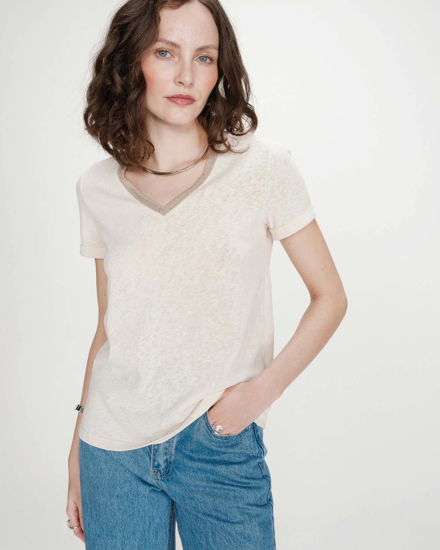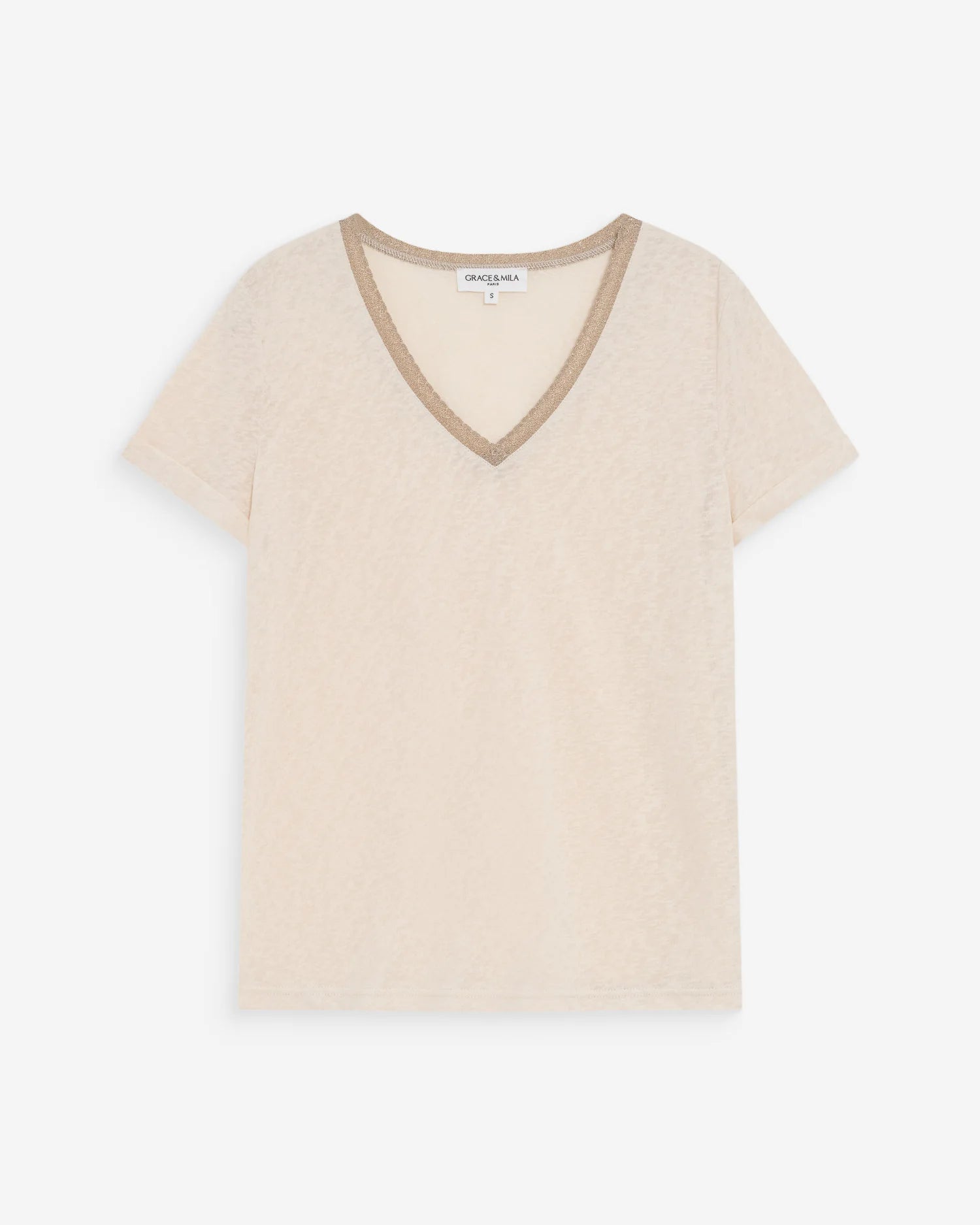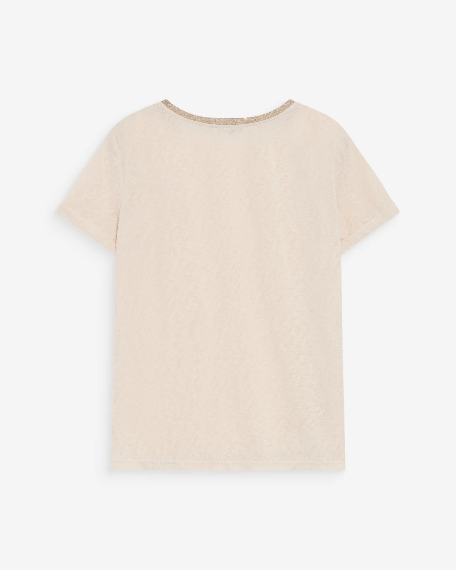 La camiseta de manga corta VASCO está adornada con un ribete de lurex en el escote en V, realzando el escote. La camiseta VASCO con escote en V tiene mangas cortas y un corte recto, formando parte de los básicos de la colección.