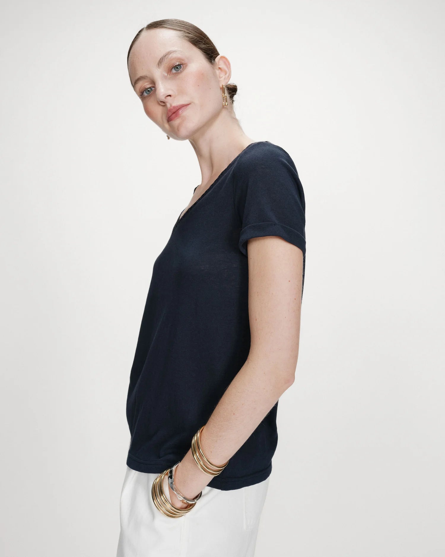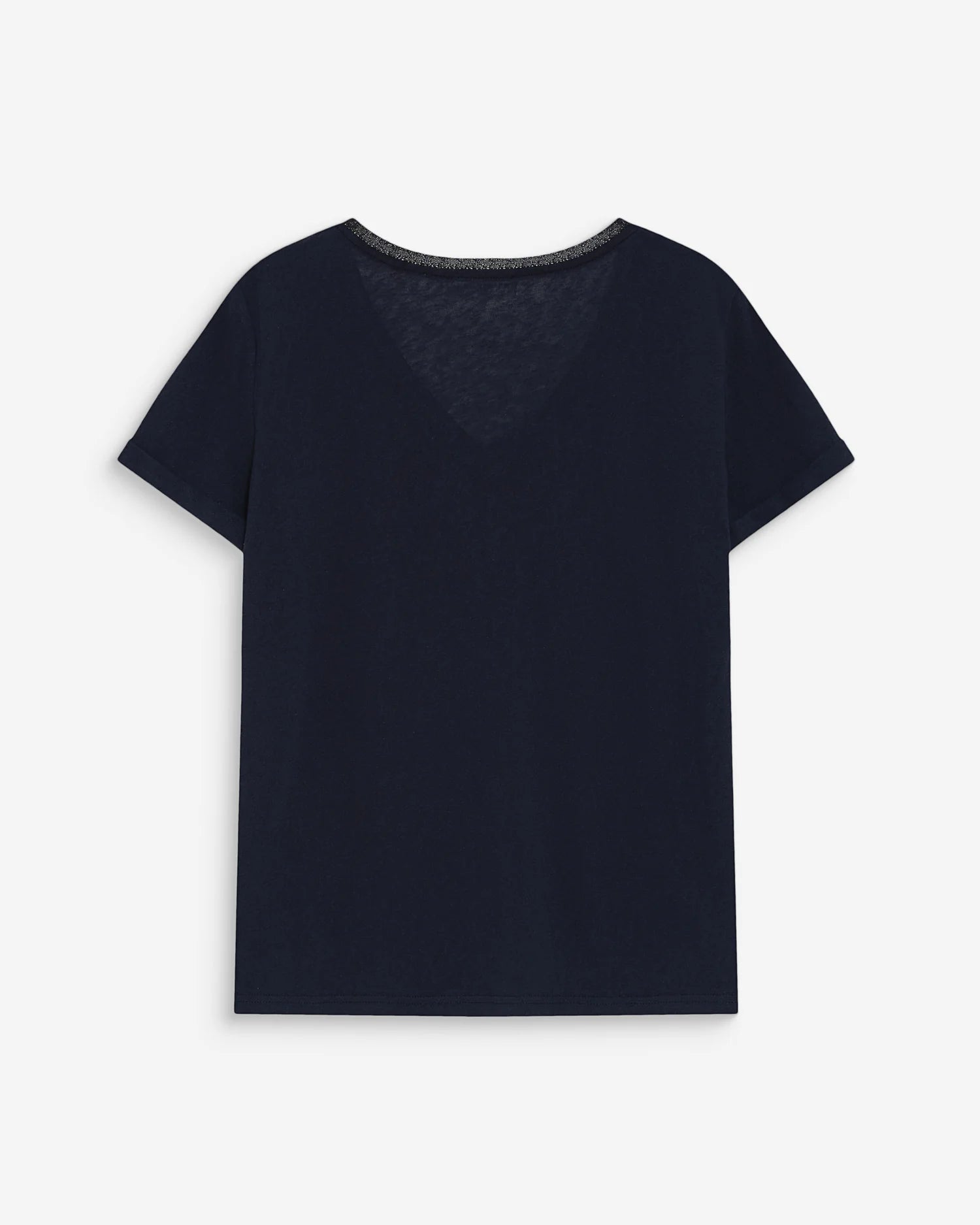 La camiseta de manga corta VASCO está adornada con un ribete de lurex en el escote en V, realzando el escote. La camiseta VASCO con escote en V tiene mangas cortas y un corte recto, formando parte de los básicos de la colección.