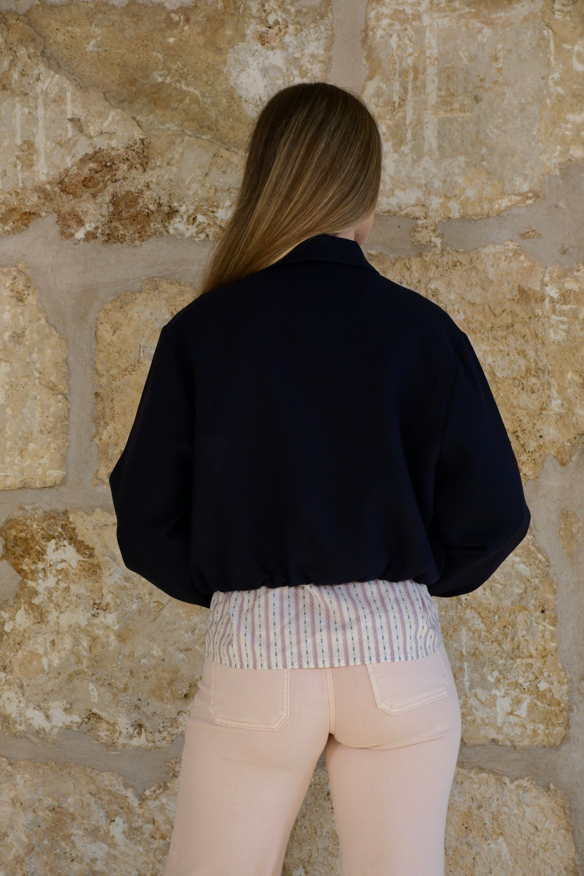 La chaqueta Maëlys reinterpreta la clásica chaqueta corta femenina con una silueta limpia y contemporánea. Su diseño en tono azul marino, con cierre frontal de cremallera metálica y cuello camisero estructurado, aporta un aire elegante y versátil ideal para el día a día. Las mangas ligeramente abullonadas y el acabado elástico en los puños crean volumen sutil y una caída fluida que equilibra la estructura del modelo. Su largo a la cintura estiliza la figura y la convierte en una prenda fácil de combinar con blusas estampadas, pantalones de vestir o denim. Una chaqueta azul marino para mujer pensada para entretiempo, perfecta como chaqueta ligera elegante, chaqueta corta femenina o chaqueta casual sofisticada.