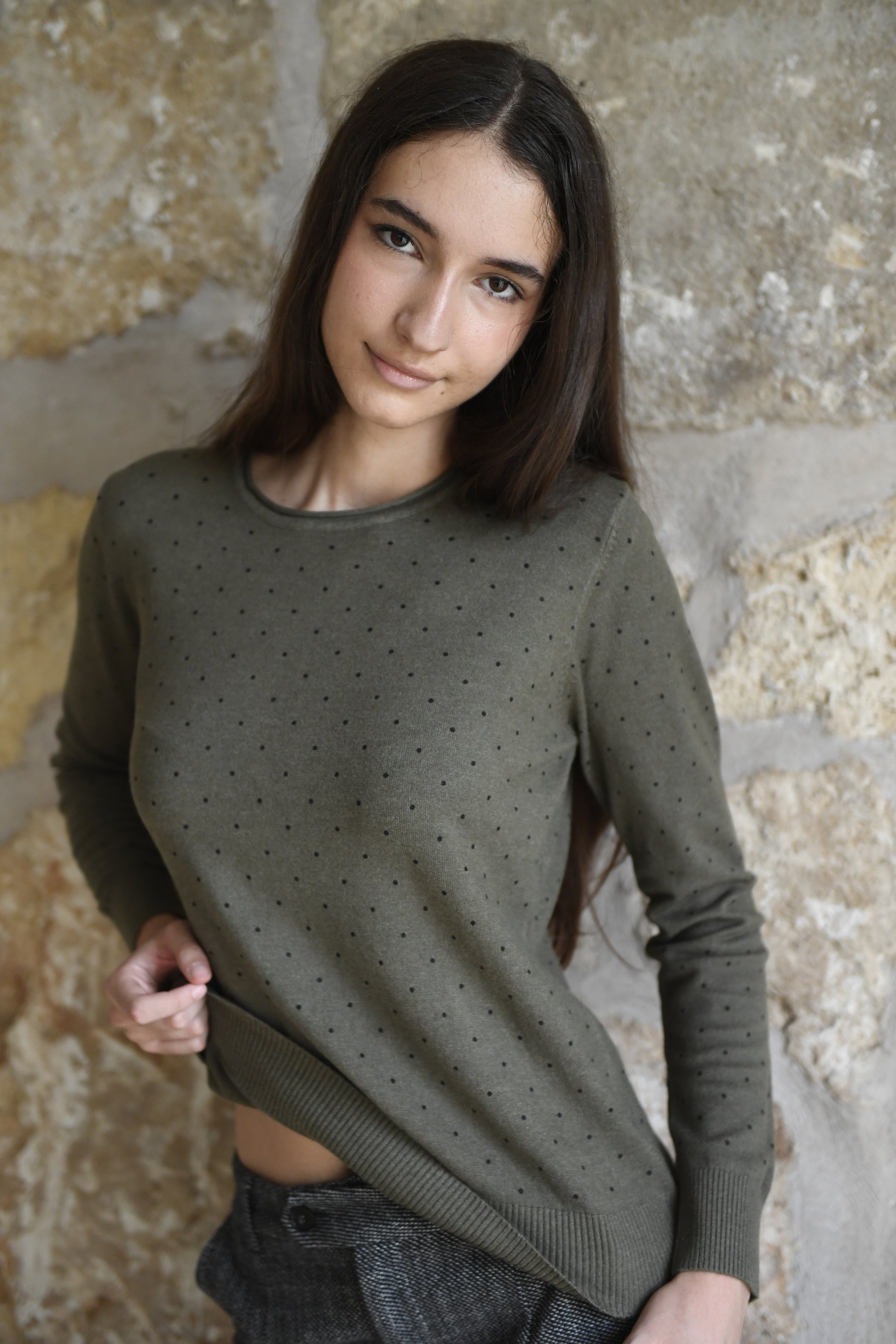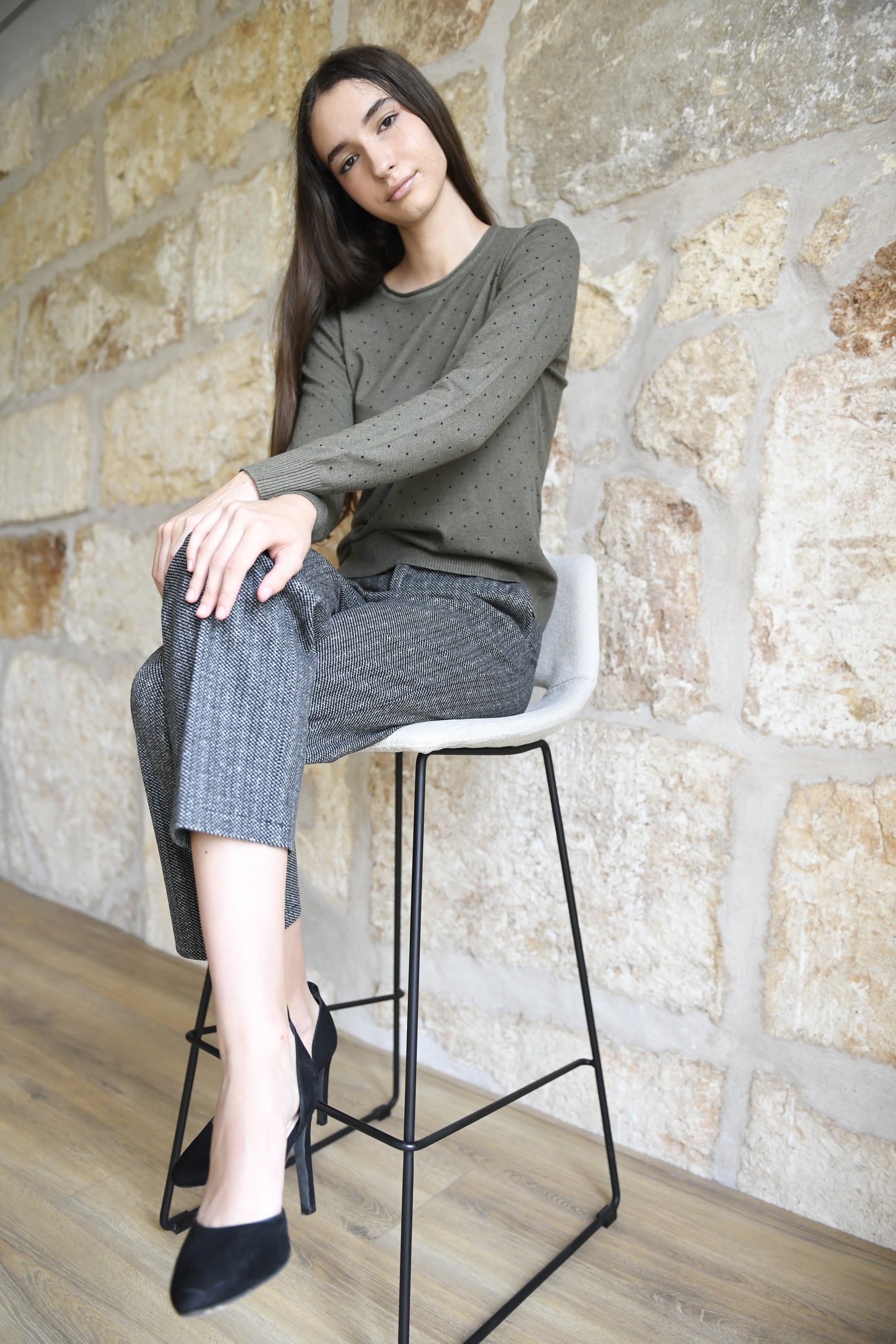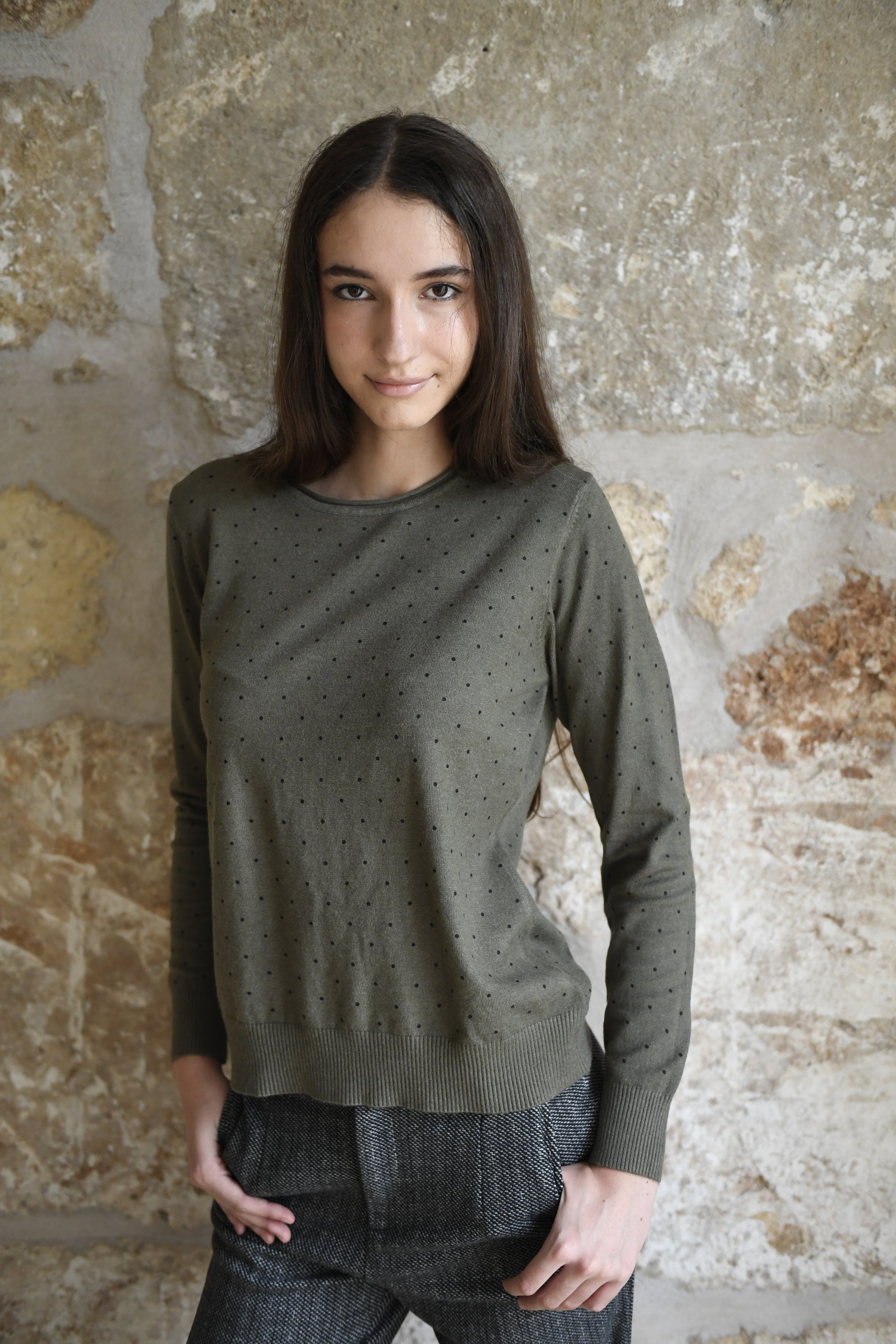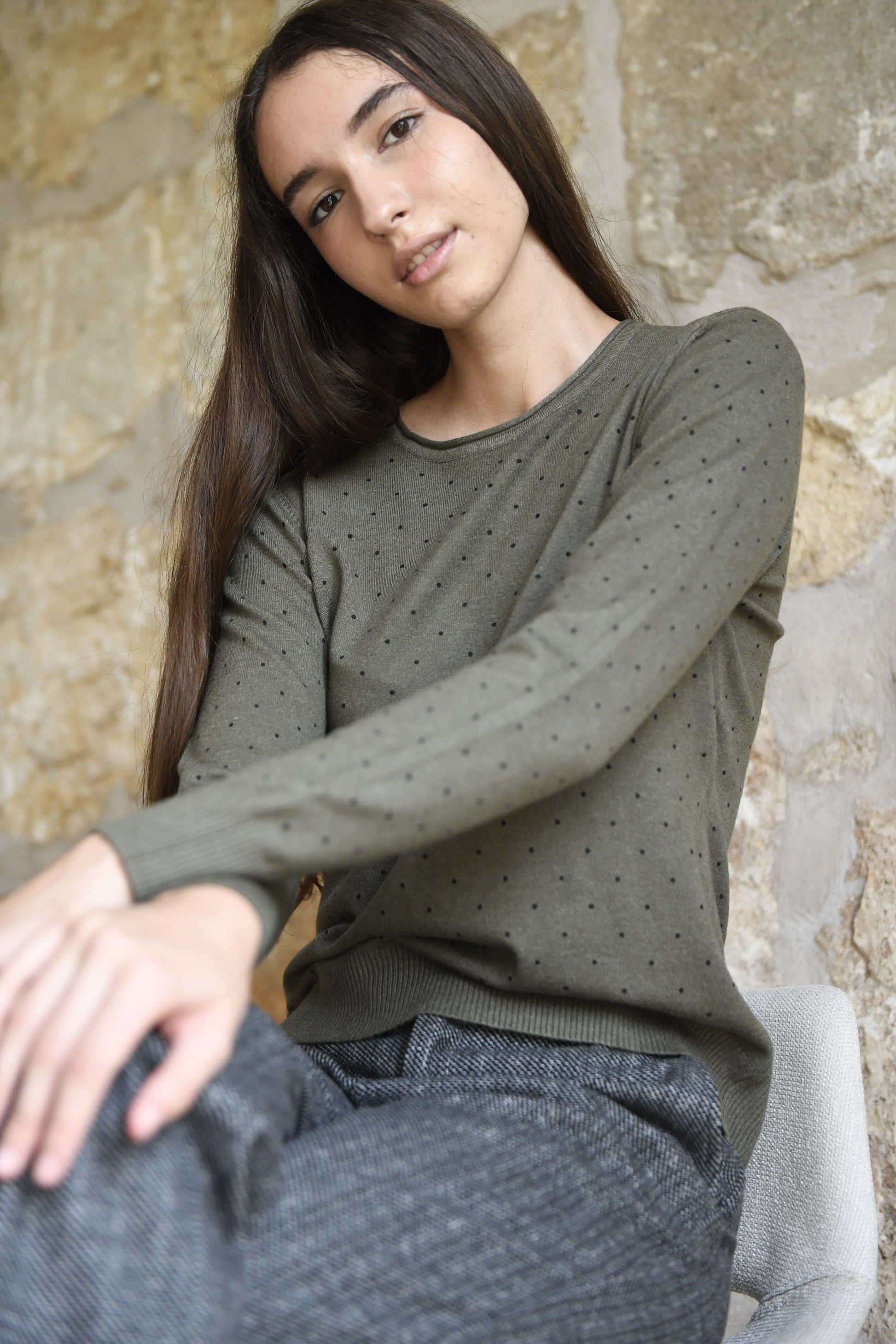 El jersei de punt amb topets és una peça bàsica i femenina que combina comoditat i estil. El seu disseny amb petits detalls brodats li dona un toc subtil i elegant, perfecte per looks de dia a dia o per combinar amb peces més formals. Disponible en diversos colors perquè trobis el que millor s’adapta al teu estil: verd caqui, rosa clar, blanc, beix i blau
