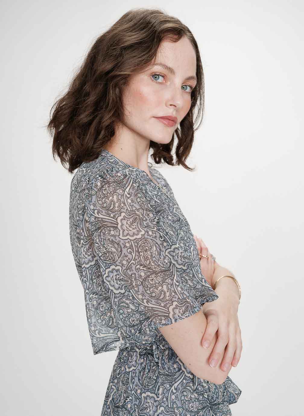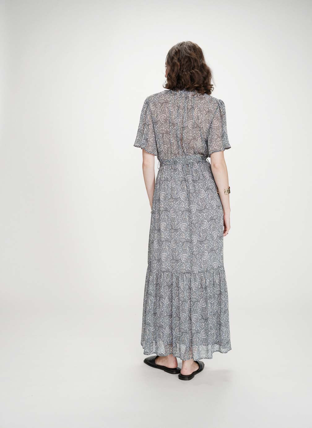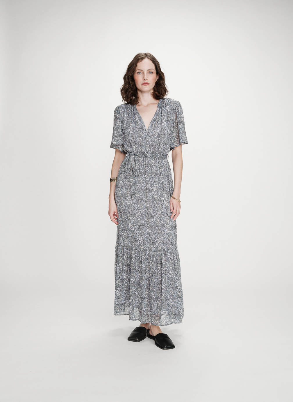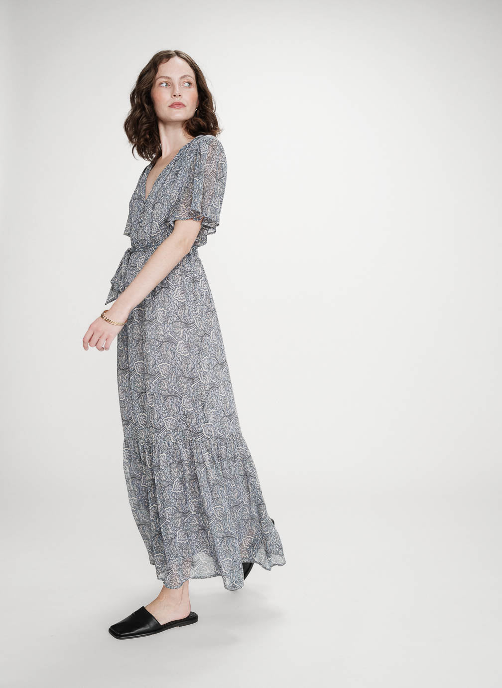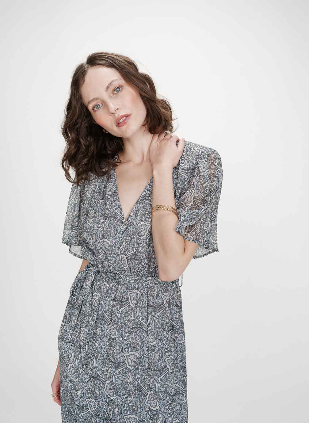 El tejido fluido del vestido largo VENELLE se realza con un estampado cachemir que dibuja una silueta ligera y elegante. Los detalles como las mangas mariposa, el escote abierto y la cintura elástica que realza la figura aportan un toque de feminidad marcada. El vestido estampado VENELLE está forrado.